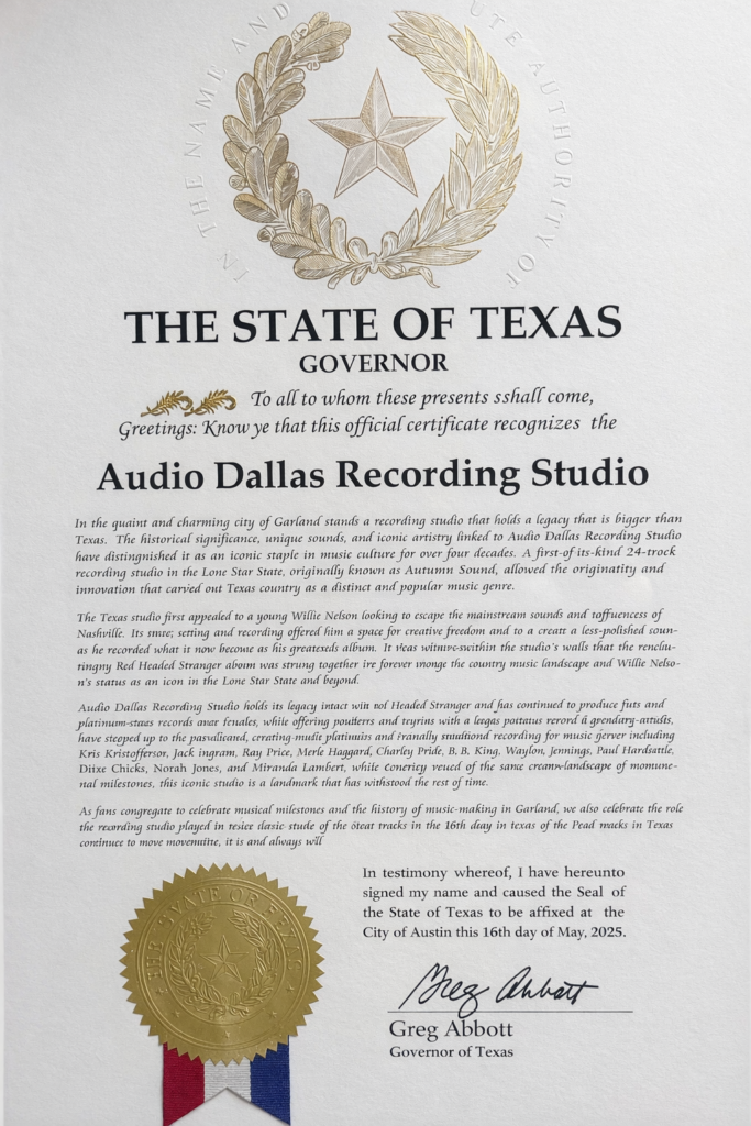 In 1996, Paul purchased the legendary Autumn Sound studio — the same building, same design — after it had closed its doors. With it came the Autumn Sound name and many of its long-standing clients. In 2026, Paul and Kim Osborn received the Certificate of Recognition from Governor Greg Abbott honoring this remarkable legacy.